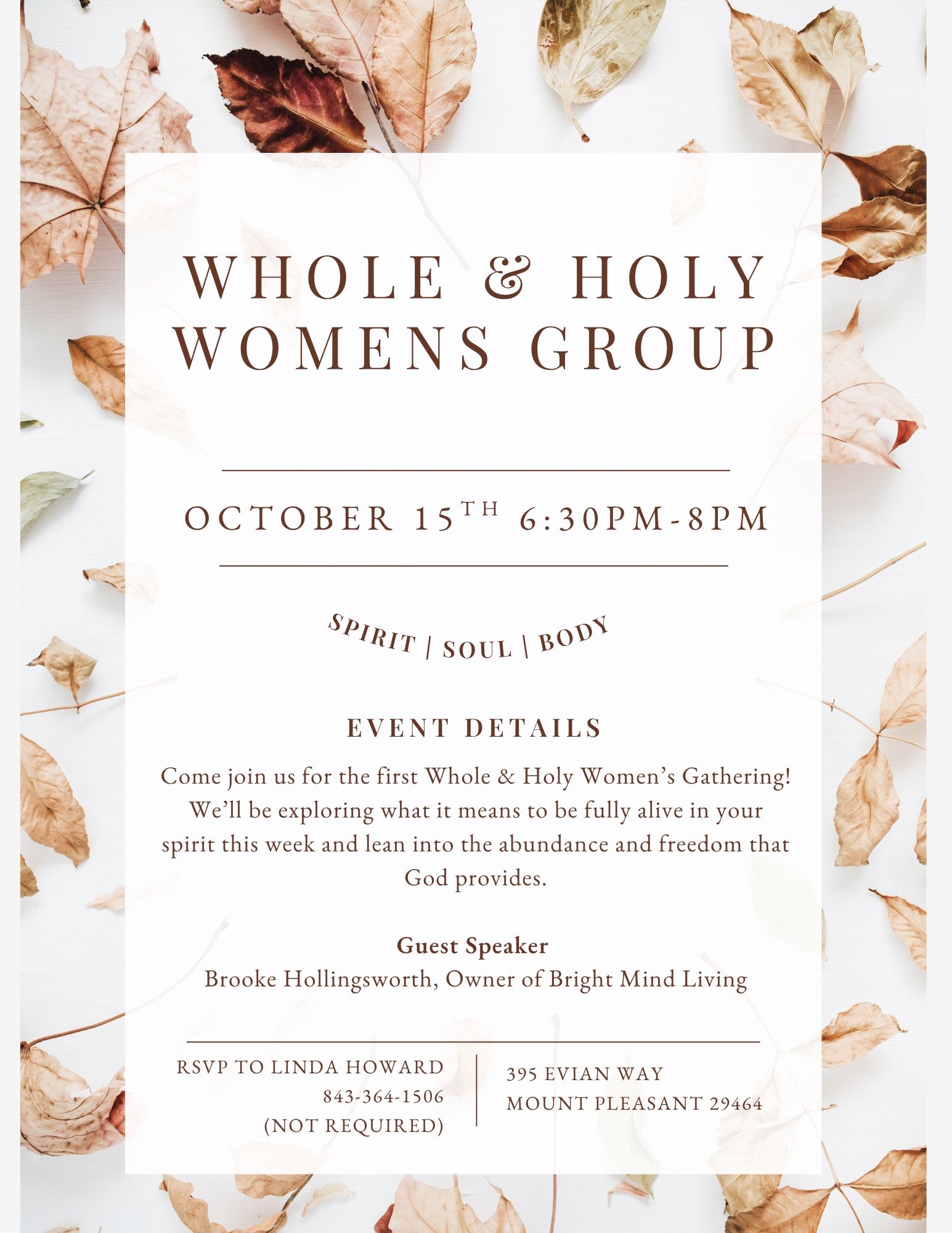 Come join us for the first Whole & Holy Women’s Gathering! We will be exploring what it means to be fully alive in your spirit this week and lean into the abundance and freedom that God provides.